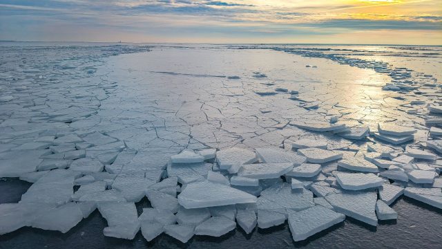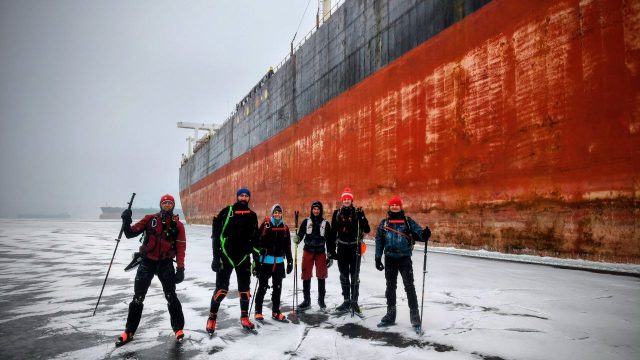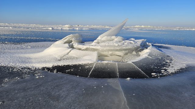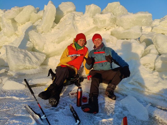 На маршруте мы сделали пару вкусных привалов, пригреваясь на солнышке у ледовых торосов, защищающих нас от ветра.