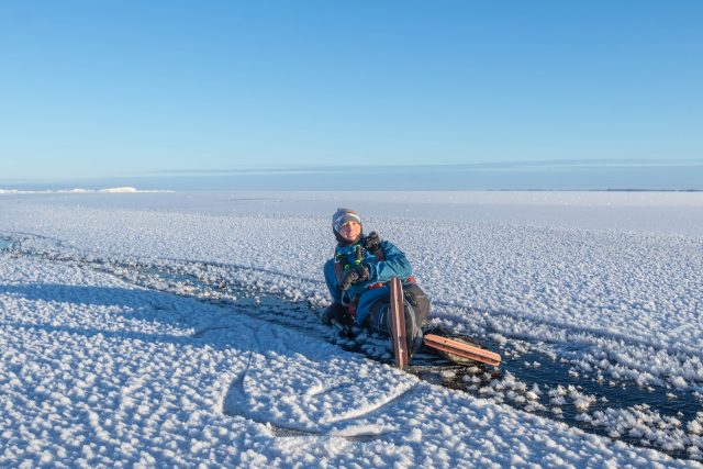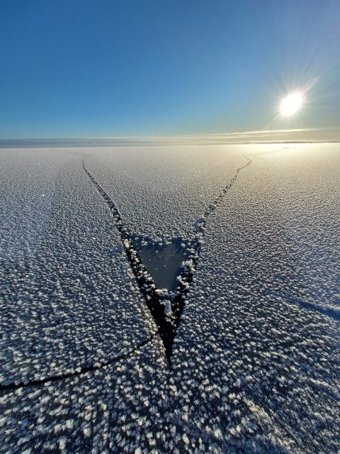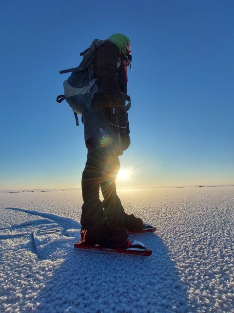На всём маршруте лёд менялся и не давал заскучать. Черный поля, белые поля с черными дорогами от аэролодок, серый лед на отмелях с камнями ,создающие выпуклые горки, торосы и звуки движение льдин. Красота!