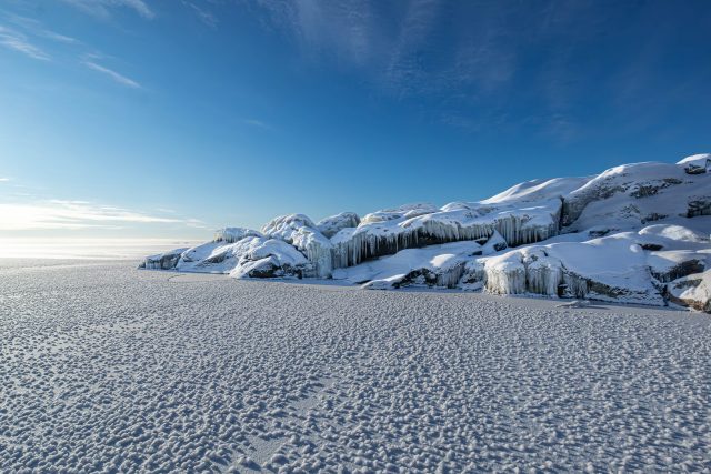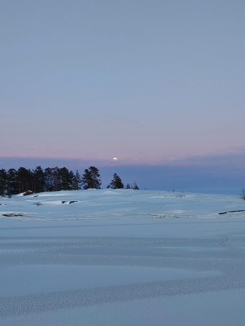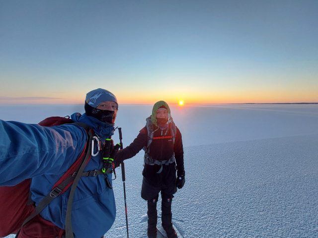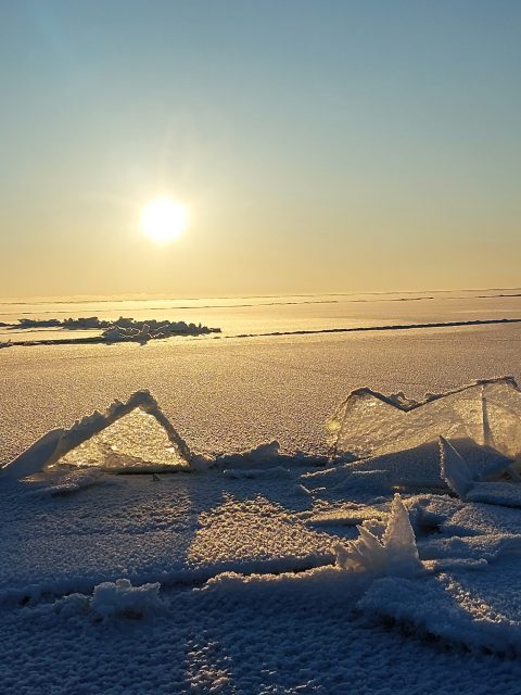 Солнце уже садится, но лёд не заканчивается, а уходит в сторону парящих сбросов АЭС. Туда нам не надо.
