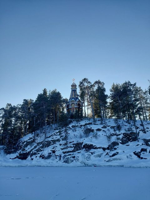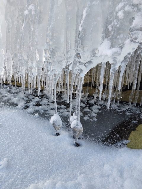 Ехать по ветру, да и еще под проблески солнца в компании таких же любителей коньков на природе, было волшебно. Огибаем по узкому краю очередной мыс и видим перед собой возвышающиеся градирни ЛАЭС! Дааа! Так мы еще не катались, едем по черному льду вдоль старого припая на фоне таких впечатляющих построек на берегу.