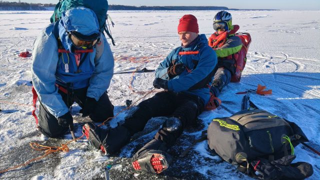 дружной компанией на льдах Финского залива, в пос.Лебяжье, под руководством Романа Лысогора мы отработали различные случаи спасения на льду:
