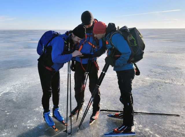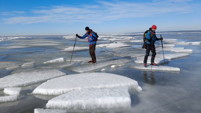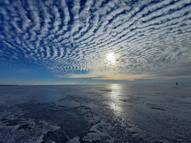 На льду мы встретились с компанией нордикскейтеров, ночевавших на берегу с палатках с вечера пятницы и наблюдавших северное сияние в ночь 20-21.03.26.
