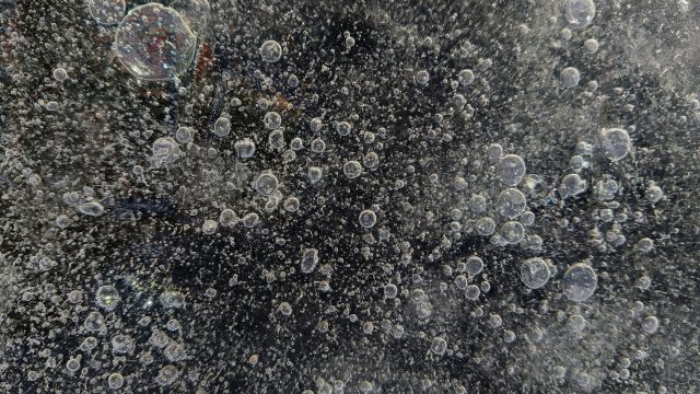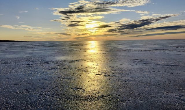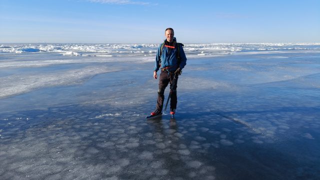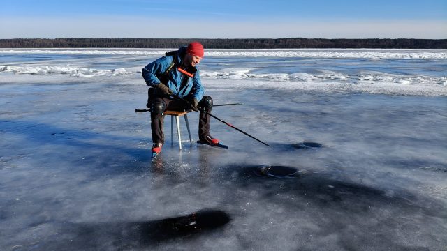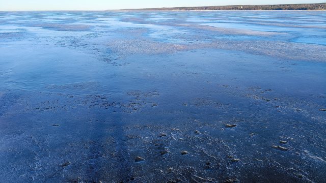 Направление в сторону Флотского на коньках нам показалось более удачным, чем вчера в сторону Толбухина, потому что солнце уже светило в спину и ловушки было хорошо видно. Мы предприняли попытку вернуться к месту старта по льду, но когда мы поехали обратно, то сразу солнце в глаза стало ослеплять и заметны уже стали только самые очевидные участки, выехали на тонкое место и развернули. Ближе к берегу много ручьёв и стоков и поэтому больше дыр с водой. И ещё чем больше рыбацких лунок мы встречаем, тем понятнее, что именно в этих локациях быстрее деградирует лёд — выехали на минное поле с лунками и снова развернулись)