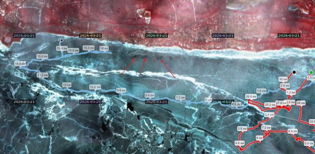 Весь маршрут — скорее исследование такого тёплого льда залива. Так поздно в марте на Финском заливе мы ещё не катались, всю дорогу был риск отрыва льдин и невозврата на берег, но всё прошло хорошо. ФЗ позволил нам прокатиться почти до обеда, хотя и выход в Песочном был долгим и полон ловушек, но мы справились.